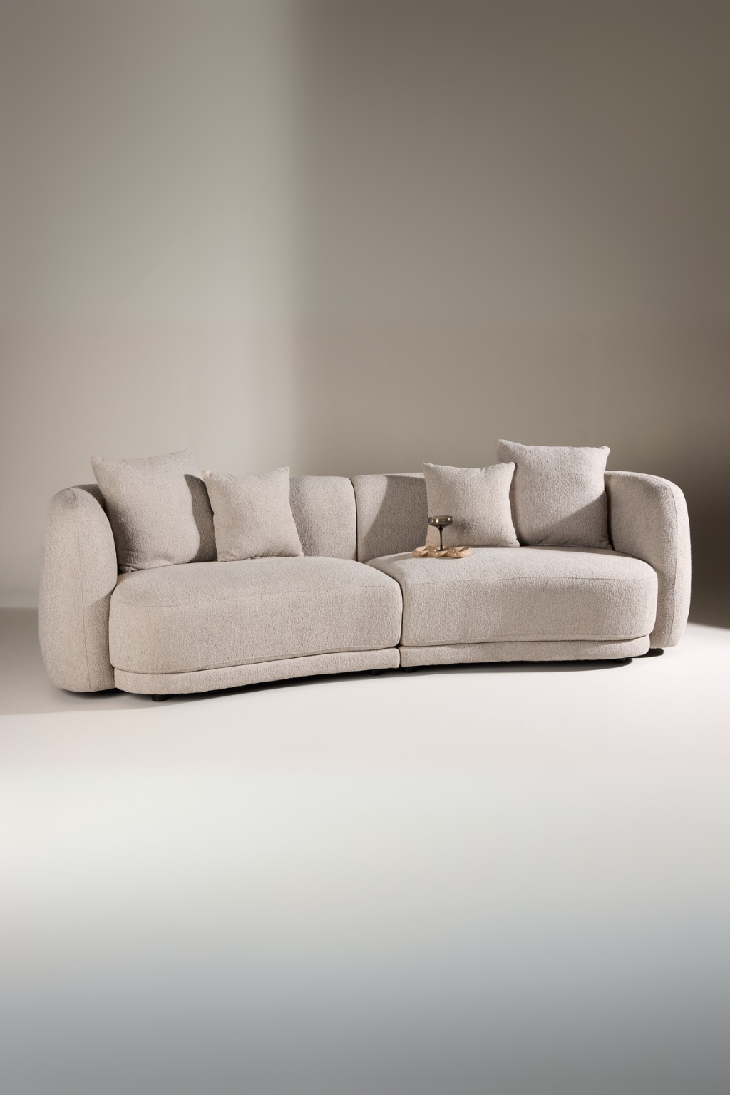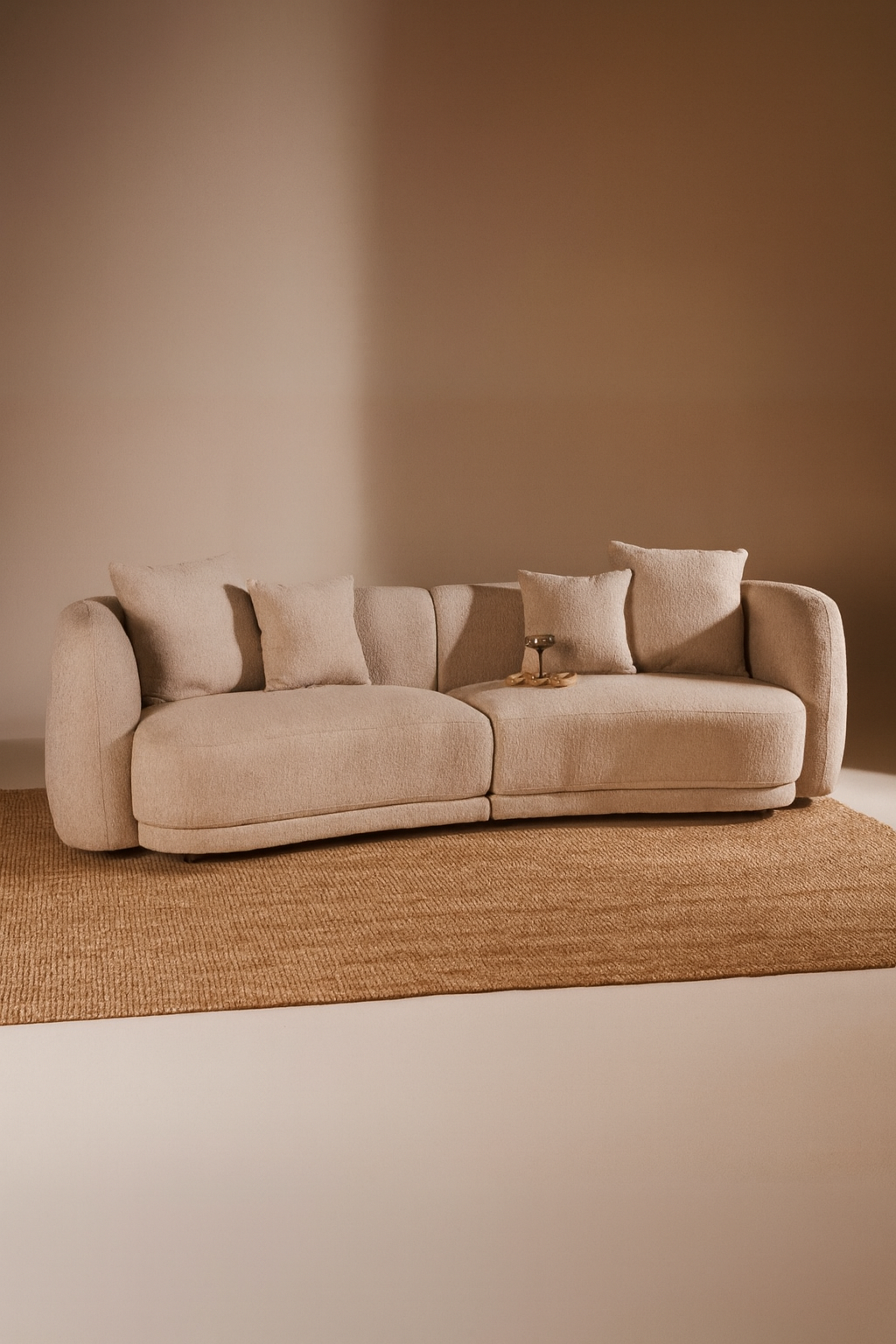 Skapa en inbjudande och sofistikerad känsla med 3-sitssoffan Cielo, klädd i lyxig beige bouclé.